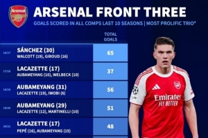 24直播网4月22日讯 《转会市场》统计了阿森纳近10年前场三人组进球情况,本赛季的约克雷斯、马丁内利、萨卡共计38球。