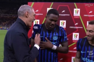 在今天凌晨进行的意大利杯半决赛次回合,国米主场3-2逆转战胜科莫,两回合总比分3-2成功晋级决赛。国米前锋小图拉姆赛后在球场上接受例行采访,但梅阿查主场球迷们庆祝的激情也影响到了小图拉姆。
