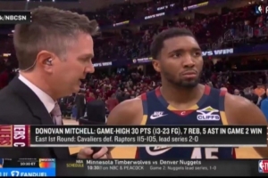 24直播网4月21日讯 在今天结束的一场季后赛中,骑士以115-105战胜猛龙。赛后,骑士球星多诺万·米切尔接受了媒体的采访。以下是完整版采访内容。