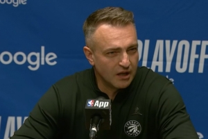 猛龙主帅:这就是季后赛的魅力所在。因为在每场比赛中,总会有其他人挺身而出。就像我们在第三场比赛中有巴特尔挺身而出并改变了局势一样。我认为施罗德在下半场表现非常出色。我们投入了大量精力去防守他们的两名主要球员,但他们阵容深度很厚。我们不能在一个回合里松懈不去防守施罗德,或者不去防守斯特鲁斯,或者不去防守梅里尔。我们必须找到继续防守这些球员的办法。要赞扬他们,他们打得很好,命中了投篮。我们现在要回家了,我们会回去看录像,为第六场准备。