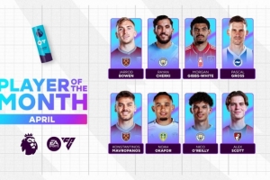 24直播网4月30日讯 英超官方列出了4月最佳球员的8人候选名单,曼城和西汉姆联各2人入选: