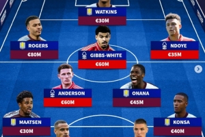 前锋:罗杰斯(阿斯顿维拉,8000万)、沃特金斯(阿斯顿维拉,3000万)、恩多耶(诺丁汉森林,3500万)