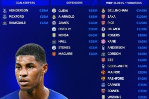 中场/前锋:贝林厄姆(皇马,1.4亿)、萨卡(阿森纳,1.2亿)、赖斯(阿森纳,1.2亿)、帕尔默(切尔西,1.1亿)、罗杰斯(阿斯顿维拉,8000万)、凯恩(拜仁,6500万)、埃利奥特·安德森(诺丁汉森林,6000万)、戈登(纽卡斯尔,6000万)、埃泽(阿森纳,6000万)、吉布斯-怀特(诺丁汉森林,6000万)、梅努(曼联,5000万)、奥赖利(曼城,5000万)、拉什福德(巴萨,4000万)、詹姆斯·加纳(埃弗顿,3500万)、鲍文(西汉姆联,3500万)、沃特金斯(阿斯顿维拉,3500万)