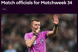 英超第34轮裁判:巴罗特执法阿森纳vs纽卡,安迪·马德利执法曼城